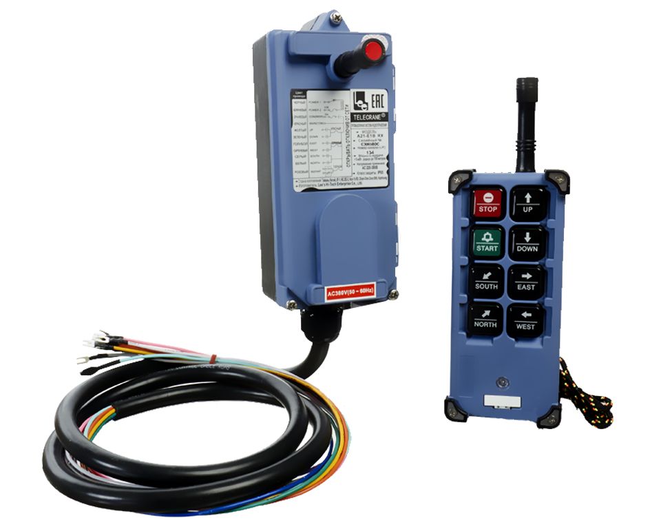 Радиоуправление "Telecrane" А21-Е1B, комплект (Пульт 6 кнопок управления + старт +стоп, 1 скорость + Приемник) (Питание приемника: 220/380 В) Внимание! Не допускается использование нескольких комплектов в одном месте с одинаковыми каналами Наличие голографических наклеек подтверждающих подлинность товара. Товар укомплектован оригинальным паспортом на русском языке с печатью. Поставка и использование только с соблюдением разрешенных радиочастот в РФ. Шильды-стикеры на русском языке. Дистанция управления до 100 метров. Низкая цена для оснащения радиоуправлением электрических лебедок, цепных и канатных электроталей, а также кран-балок. Низкое энергопотребление передатчика (2 батарейки размера АА срок работы до 4 месяцев). Стандартное питание приемника: 220-380 V, возможно исполнение приемника на 12-24 V Диапазон температур -35°С ~ +85°С. Класс электрозащиты устройства IP65. Лёгкое программирование совместимое с Microsoft Windows для настройки по потребностям заказчика. Корпус изготовлен из прочного фибер-гласа.