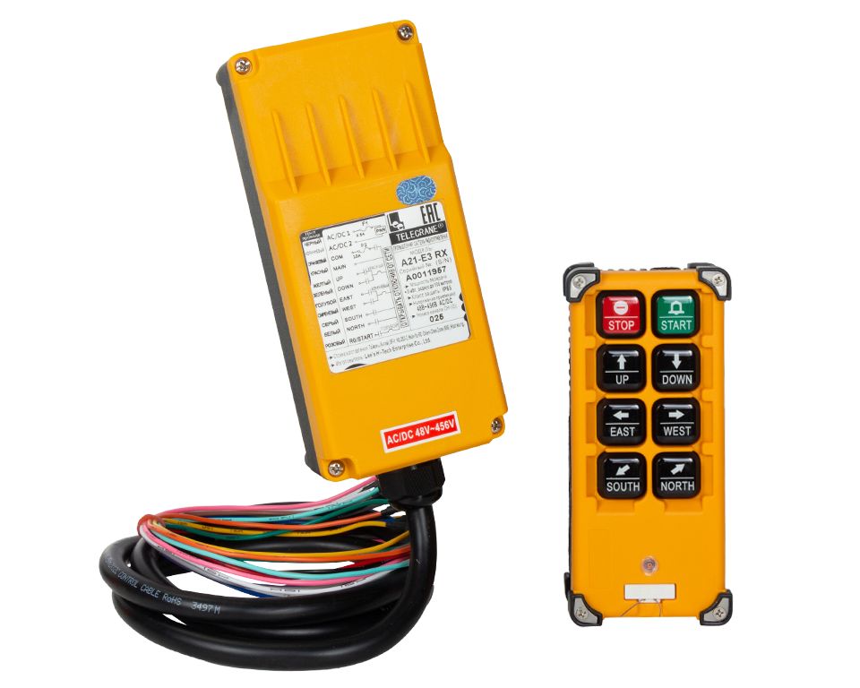 Радиотехнология нового поколения. Автоматический выбор частоты, технология изменения частоты в реальном времени. Доступно 35 разных каналов. Защита от перенапряжения. Широкий диапазон питания. Внутренняя антенна. Радиочастотный фильтр. Экономия бюджета, работа от двух батареек AA, с регулируемым рабочим диапазоном. Возможность подключения трех вариантов передатчиков на ваш выбор. Сохранение настроек на электронной карте e-Card. Радиоуправление "Telecrane" А21-Е3B, комплект (Пульт 6 кнопок управления + старт +стоп, 1 скорость + Приемник) (Питание приемника: 220/380 В) Внимание! Не допускается использование нескольких комплектов в одном месте с одинаковыми каналами Наличие голографических наклеек подтверждающих подлинность товара. Товар укомплектован оригинальным паспортом на русском языке с печатью. Поставка и использование только с соблюдением разрешенных радиочастот в РФ. Шильды-стикеры на русском языке. Дистанция управления до 100 метров. Низкая цена для оснащения радиоуправлением электрических лебедок, цепных и канатных электроталей, а также кран-балок. Низкое энергопотребление передатчика (2 батарейки размера АА срок работы до 4 месяцев). Стандартное питание приемника: 220-380 V, возможно исполнение приемника на 12-24 V Диапазон температур -35°С ~ +85°С. Класс электрозащиты устройства IP65. Лёгкое программирование совместимое с Microsoft Windows для настройки по потребностям заказчика. Корпус изготовлен из прочного фибер-гласа.