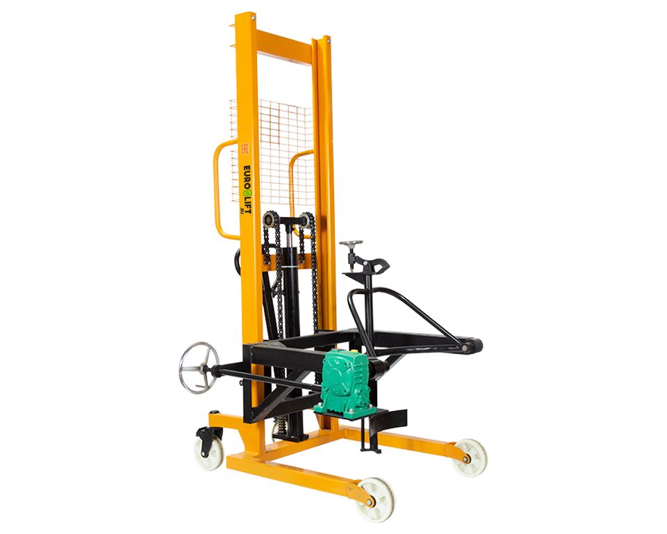 Штабелёр опрокидыватель COT 0.35, г/п 350кг, в/п 1700мм, (1190х890х2000), вес 185кг. Штабелер для бочек EURO-LIFT предназначен для перемещения и дальнейшего опрокидывания жидких грузов перевозимых в металлической бочках. Штабелеры обеспечивают надежную фиксацию бочки и позволяют осуществить транспортировку или переворот тары без особых усилий со стороны оператора.