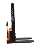 Данный штабелер легко управляется с помощью многофункциональной ручки управления. Отличительной чертой данной модели являются его размеры. Его корпус значительно тоньше, чем у полностью самоходных моделей. Ручка управления перенесена из центральной части в левую, поэтому оператор может с легкостью управлять им стоя сбоку. Это позволяет применять его в более узких проходах, где работа самоходного штабелера невозможна.